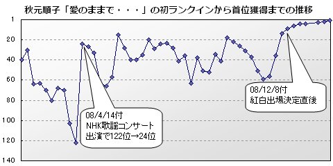 秋元是以61岁又7个月的年龄获得首位,而此前最年长的记录为小田和正的59岁又11个月(2007/8/27付「こころ」获得1位)。同时上一次女性演歌歌手获得首位是在22年前。当时获得周冠的是(城之内早苗「あじさい桥」1986/6/23)。而秋元从初上榜(※TOP100基准)历经50周才获得冠军,这个记录也是历代第2位。第一名是中岛美雪的《地上の星/ヘッドライト・テールライ》当时她用了130周才获得冠军(冠军日期:2003/1/20付)。而这也是继2007年的秋川雅史「千の风になって」以来,再次有人因为在红白出场而在单曲周榜夺冠。
