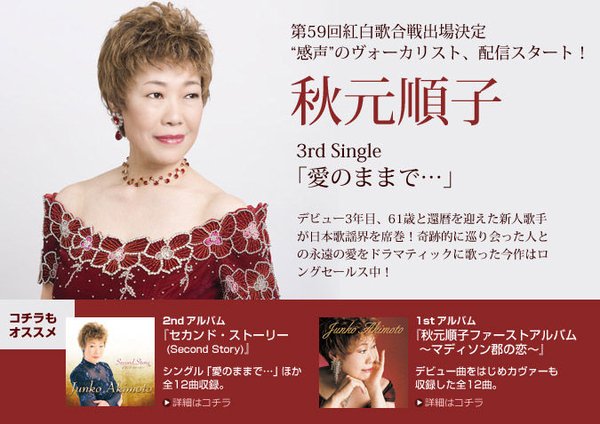 秋元顺子1947年6月21日出生于东京都江东区深川。2008年1月23日发行的「爱のままで…」是秋元的第三张单曲,但直到以61岁的高龄在2008年除夕的NHK红白歌会初登场后,很多人才认识了这位2005年出道的奶奶级歌手。2008年1月23日发行时,这张单曲在周榜仅仅取得第40名。在参加『NHK 歌謡コンサート』的演出后,排名得到了很大地提高,并且那次还获得了演歌的首位。从那时候再到11月末决定红白首次出场的时候,单曲排名再次急升。在2009/1/26付的ORICON单曲周榜中,因红白大热的[爱のままで…]终于在发行一年后获得第一名,又制造了新的话题!这是60代的歌手首次获得周间第一,同时也是最年长的单曲周冠者。对此秋元表示「她会一直持续唱到更老为止」