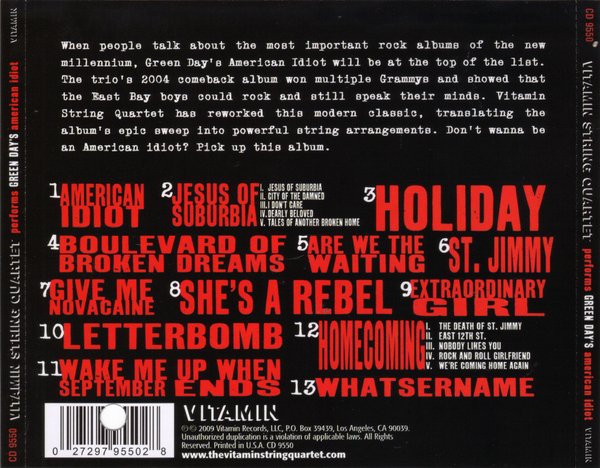 (大意)当大家谈起新千年里最重要的摇滚专辑,Green Day的《American Idiot》绝对在名单前列,该专辑展示了Green Day的摇滚精神并用其表达他们的思想。Vitamin String Quarter重塑了这张格莱美最佳现代经典,将这部史诗用小提琴、中提琴和大提琴演绎出来。