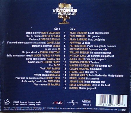 02年法国ULM Records唱片公司发行的CD合辑,收录总共16届的法国乐坛"葛莱美奖"【Les Victoires de La Musique】(音乐之光音乐奖)(86-02)的歌曲,非常值的初听法语音乐的人听.这套CD非常不错。