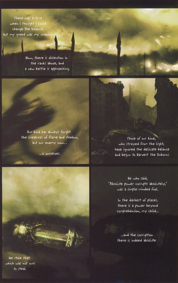 Keith, 以及这样一种想法,那就是有时你必须冒很大风险只是为了证明你的想法是对的。他在这个项目中从不妥协,并严肃地对待这个题材。做这项工作不容易。这项作品 在Ronin工作室启动。我们用别人用来做电影而不是做画册小说的的技术创造了很多特效,Keith尊重这种做法。他为此投注了最大的努力,我们都是如 此。有一天我说:“让我们为了这个全力以赴吧!这个恶魔需要变得强大一些--再多五页!”然后一天过去了,他会提议说:“我又有个想法--把这个恶魔变得 更强大吧--我们再多做十页怎样!”事情就是这样,我们在这本书上所做的努力比其他任何一本都要多。我们为《升华》所做的工作也将影响到Ronin工作室 将来所做的每一本书。Keith尊重才华,他自己就是个天才。