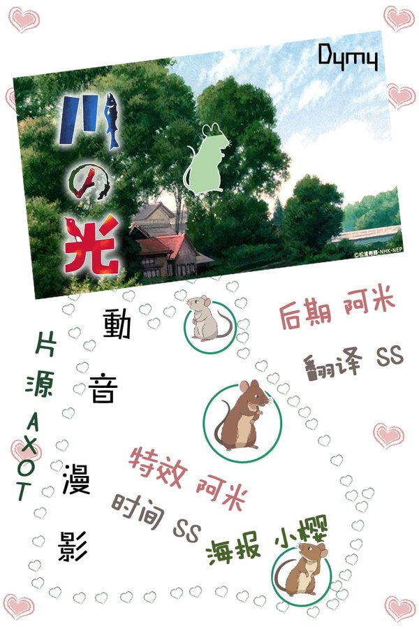 【片名】Save the future 【中文名】川之光 【字幕】DYMY 【格式】RMVB 【内容介绍】 故事叙述父子三鼠住在河边过着平静的生活,原以为能在河畔眺望河光度过一生,死后化成雨、汇成小流,与喜爱的河川永远融合一体。不料,东京都建设局打算兴建工程将河川铺成暗渠,它们只能离开家园,展开漫长惊险的旅程 【cast】 タータ 折笠富美子 チッチ 金田朋子 お父さん 山寺宏一 タミー 平野綾 グレン 大塚明夫 ブルー 田中敦子 スズメの母 藤原纪香 バスの运転手 松本和也 爷さんネズミ 青野武 【staff】 原作 松浦寿辉 监督 平川哲生 演出协力 原恵一 脚本 吉冈たかを キャラクターデザイン 丹内司 美术监督 山本二三 美术 稲叶邦彦、日野香诸里 撮影监督 枝光弘明 音响监督 たなかかずや 音楽 栗原正己 タイトルロゴデザイン 下り藤敏男 アニメーション制作 ぎゃろっぷ 制作 NHKエンタープライズ 制作・著作 NHK 【官方网站】 http://www.nhk.or.jp/savethefuture/kawanohikari/