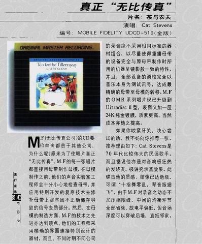 这张专辑里最被后人传唱得无疑是《Wild World》和《Sad Lisa》两首作品,它们的意义也丝毫不会逊色于纽约民谣歌手Don McLean的《American Pie》、《Vincent》两首大作。《Wild World》最初听到的是Mr.Big的翻唱版本,已经被唱成了一首气势逼人的作品,在当时并没有觉得什么,但是到听斯特文斯的原唱时才发现Mr.Big原来是在对《Wild World》(狂野世界)这首歌进行毁灭性的破坏,狂野倒是狂野十足了,但是当狂野只流于形式时,它只会让人觉得野蛮,听我们的斯特文斯的演唱你就会觉得狂野未必就是吹胡子瞪眼,狂野也可以有一种温良的表达,说穿了,其实狂野也是一门独特的艺术。与这首歌相同经历的是,我听《Sad Lisa》(悲伤的莉莎)同样是先听齐豫的翻唱,齐豫的演唱更接近仙音,一种纯艺术的嗓音,被无限地拨到空中,当然也是一种听觉上的享受,不过我还是喜欢斯特文斯"脚踏实地"式的演唱,像是一个一百岁的老人在历经沧海桑田之后倾心的演唱,那呜咽的大提琴和不经意间于右侧声道敲出的琴弦声虽然都来自人间,可又仿佛是一种隔世的通灵物,差一步到天堂就是这样的感觉。
