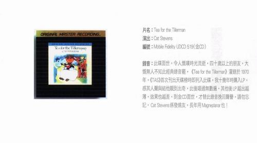他的作品有别于同时代其他同型歌手,对各国民间音乐都有很深的研究和探索,并将其融入到自己的作品中,同时他还是位发烧大拿,非常讲究唱片的录音效果。这张Tea For The Tillerman是他的代表作,也是史上最重要的民谣唱片之一,Mr.Big曾经翻唱过其中那曲著名的Wild World,再度风靡一时。