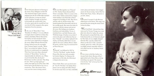 对一名作曲家来说,很少会仅仅因为一个人,因为她的容貌或者人格而被激发出创作灵感,但是有一个人真的做到了。她不仅仅激发我写出了《月亮河》,还有《谜中谜》和《俪人行》。如果你听过这些歌曲,你一定能够猜出是谁激发我的创作灵感,因为在这些歌曲中都明显带有着奥黛丽强烈的个人气质—一种淡淡的忧伤。通常来说,我需要完整地看一遍电影,才能够为电影谱写音乐,不过创作这几首曲子的时候,我只是看了剧本而已。当我第一次遇见奥黛丽的时候,我就知道《月亮河》会成为一首非常受欢迎的歌。我了解她的声音特质,我早就相信她能够把《月亮河》演绎得尽善尽美,没有人可以比她更能够体会这首歌的含义,也没有人可以比她更能够表现出自己的感受,时至今日,仍是如此。