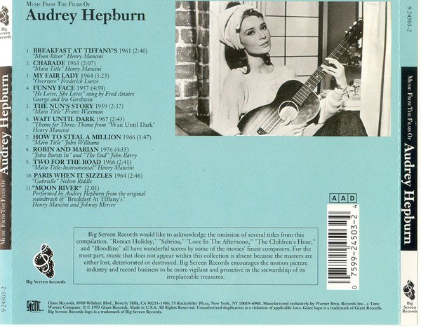 该专辑收录了奥黛丽·赫本主演的大部分电影的经典配乐。其中最为珍贵的便是收录了奥黛丽赫本演唱的月亮河(Moon River)。如果你看过大部分影片很快就会找到熟悉的感觉。