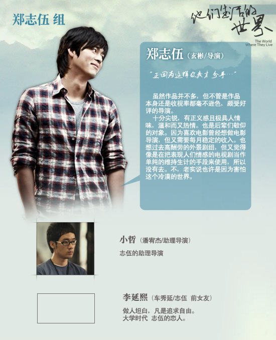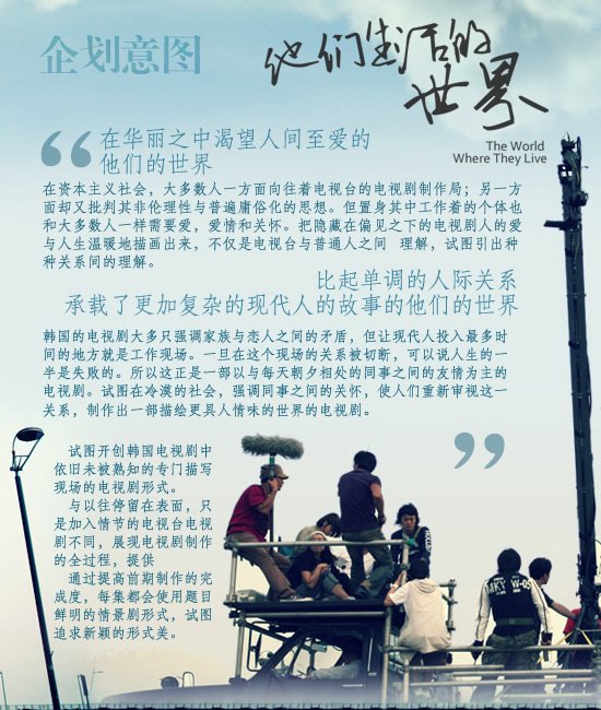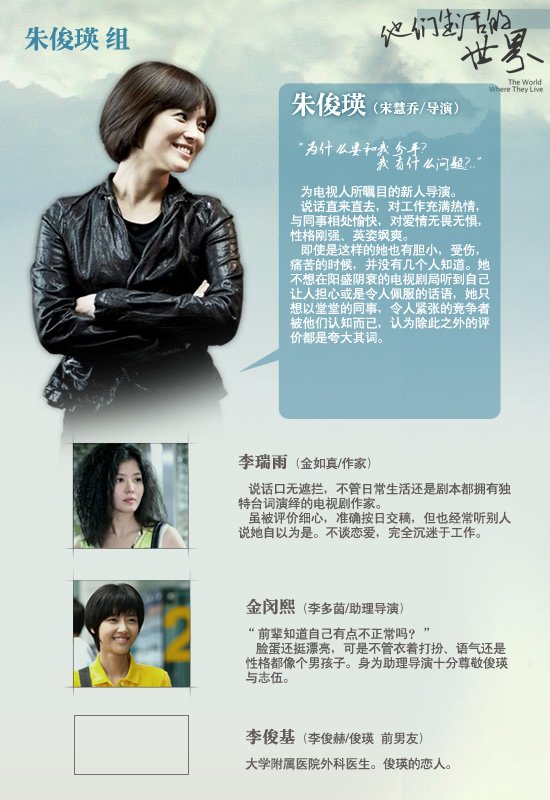 【中文剧名】他们生活的世界 【电视台】韩国KBS2 【官 网】http://www.kbs.co.kr/drama/worlds/index.html 【首 播】2008年10月27日 【接 档】恋爱结婚 【回 数】16集 【导 演】表民洙(KBS 浪漫满屋,仁顺很美丽,孤独,蓝雾,MBC 你来自哪颗星) 【编 剧】卢熙京(KBS 我们几种幸福的问题,Goodbye Solo,生活如歌,比花还美) 【演 员】宋慧乔, 玄彬, 李多仁, 严基俊, 裴宗玉, 徐孝林等 【格 式】RMVB 【语 言】朝鲜语 【字 幕】中文字幕 【