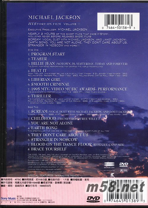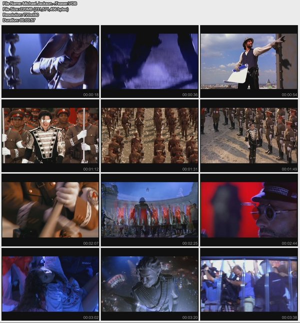 首先是Michael Jackson1995年MTV颁奖典礼获最佳表演奖现场片段,收录于《MICHAEL JACKSON HISTORY ON FILM Vol II》DVD专辑中。个人感觉最能体现MJ毕生精华之版本。由于社区先前发布版本分辨率过低,质量太差,应广大乐迷要求,特此自制VOB格式的重发版本。因为软件对码率的限制,依然有少许锯齿,但相比先前版本有很大提高,几乎不能察觉。希望大家喜欢!以前找这个资源的人不多,加上自己有原版光碟,所以老源被移除。今天重新制作放出新源供大家下载!