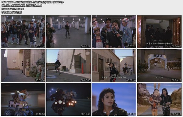 Badder & Speed Demon - MJ80年代后期经典MV。由《Bad》的儿童版本和《速度之魔》组成。那时已经可以窥探到MJ的童心未泯,以致酿成后来不被世人所理解而被以娈童起诉。而所有这些无非都是为了金钱的最终目的。在我们爱MJ的人的眼里,他其实永远都是一个孩子。这种东西世俗的人是永远无法明白的。先前社区的《速度之魔》已经无源,加之自己非常喜欢这支MV,所以制作了两个版本。VOB内嵌字幕版和无字幕剪裁版。效果上字幕版本要稍微逊色于原版,大家酌情下载!