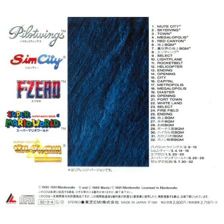 : Disc One (71:57) 01. MUTE CITY (F-Zero) * 3:23 02. SKYDIVING (Pilotwings) * 4:13 03. TOWN (SimCity) * 3:25 04. MEGALOPOLIS (SimCity) * 4:30 05. RED CANYON (F-Zero) * 3:22 06. Above Ground BGM (Legend of Zelda: A Link to the Past) * 3:51 07. Reverse World Above Ground BGM (Legend of Zelda: A Link to the Past) * 4:18 08. Ending (Super Mario World) * 6:08 09. SELECT (Pilotwings) 0:42 10. LIGHTPLANE (Pilotwings) 1:54 11. ROCKETBELT (Pilotwings) 1:48 12. HELICOPTER (Pilotwings) 1:30 13. ENDING (Pilotwings) 1:14 14. OPENING (SimCity) 0:46 15. CITY (SimCity) 1:59 16. CAPITAL (SimCity) 1:44 17. METROPOLIS (SimCity) 1:44 18. MEGALOPOLIS (SimCity) 2:18 19. DIASTER (SimCity) 0:35 20. OPENING (F-Zero) 0:37 21. PORT TOWN (F-Zero) 2:14 22. WHITE LAND (F-Zero) 1:53 23. SELECT (F-Zero) 0:31 24. FIRE FIELD (F-Zero) 1:46 25. ENDING (F-Zero) 1:11 26. Above Ground BGM (Super Mario World) 1:33 27. In the Water BGM (Super Mario World) 1:52 28. Castle BGM (Super Mario World) 2:49 29. Bonus Screen BGM (Super Mario World) 1:12 30. Hyrule Castle BGM (Legend of Zelda: A Link to the Past) 3:03 31. Kakariko Village BGM (Legend of Zelda: A Link to the Past) 1:53 32. Battle with Ganon (Legend of Zelda: A Link to the Past) 1:59