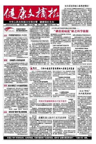 《健康文摘报》是中华人民共和国卫生部主管、健康报社主办的全国第一张以传播健康知识为主要内容的文摘类报纸。荟萃了国内外最新医学科研信息和医学科普知识,内容丰富、通俗易懂、科学权威,深受各阶层读者,特别是中老年读者和患者的喜爱。被评为“全国百家优秀报刊”、“文摘十佳”报纸,被国家邮政集团总公司列为2008年全国畅销报刊及2009年度中国邮政发行的重点品种。《健康文摘报》每周两期(周三、六出版),每期八版。辟有《健康新闻》、《家庭医学》、《用药指南》、《益寿之道》、《海外资讯》、《心灵驿站》、《性与婚恋》等16个专栏。