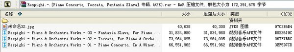 雷斯庇基(1879-1936),意大利作曲家。原为小提琴演奏家,1900年赴俄国,曾在圣彼得堡歌剧院乐队任首席小提琴,后成为里姆斯基-科萨科夫的学生。1902到柏林,又拜布鲁赫为师。1913年起任罗马圣契西里亚音乐学院作曲教授,1923-1925任院长。雷斯庇基的创作受其老师里姆斯基-科萨科夫配器追求色彩感的影响,而又追求古典曲式,其作品融合了意大利式歌唱、传统的德奥曲式、俄罗斯式民族色彩三者因素,创作上的最大成就是配器。——引自《音乐圣经》 《罗马三部曲》是他的代表作,相信古典迷们都是很熟悉的了。本碟收录的是他的钢琴作品,不多见。A小调钢琴协奏曲、为钢琴与乐队而作的托卡塔、为钢琴与乐队而作的斯拉夫幻想曲。钢协与斯拉夫幻想曲都是他早期的作品,斯拉夫幻想曲作于1903年,自然地被认为是反映雷斯庇基呆在圣彼得堡和短暂的跟随里姆斯基-科萨科夫学习时期的作品。作品一开始展示的是一个典型的斯拉夫旋律,出现在钢琴独奏之前,随后是舞蹈元素出现,两者在钢琴与乐队之间互相交织,接下来有很多戏剧性与炫技性的段落。 APE+COVER