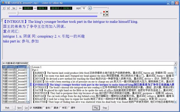 本次更新了合购群提供的刘毅词汇系列台湾版下载地址,其内容和flyingeagle1123发布的是同一资源,因有些朋友问我关于系列mp3同步字幕问题,所以才想起了做个链接过来。其详细内容和下载地址如下: http://www.VeryCD.com/topics/2812660/ 同时10000和22000全部做好,所有文本和音频可以到下面我的博客中去下载。如有问题请到我的博客中讨论。 欢迎访问我的博客交流学习 所有音频与文本如下: http://blog.sina.com.cn/u/15915115?retcode=0 所有音频如下: http://www.tudou.com/home/_69907543 200920增加voa1500精听版链接页面 http://www.VeryCD.com/topics/2769245/ 一、简介:本书所列单词共计1300个,加上各词的衍生词、同义词及反义词,则实际收录约3000词,均为平时最常用、最容易接触到的单词。 详细列出各词的国际音标、词性说明及中文解释,省却查字典的麻烦。中文解释是以该词最常用的意义为主,一词若有若乾常用解释或词性,则一并列出。单词后面附有例名,以说明该词的用法;例句附有中文翻译,以便对照参考。 每一课分为五个部分,以便于分段记忆。在课前有预备测验,每一部分之后有习题,课后有效果检测,可借助于重复测验来加深对单词的印象,并学习如何活用单词。 本书共分为24课,建议进度为一天一课,如此便可在一个月内增加3,000个词汇。。 二、发布意图:英语学习最大的阻碍就是词汇量,如何记住大量的词汇,市面上已有不少这方面的图书。有的录制单词念一遍英语单词,再念一遍汉语释义;还有的乾脆用数篇文章包揽上万个单词,读懂了文章就懂了单词;还有的乾脆背字典等等。这些方法都让我们半途而废,原因是背字典乏味,背长文章枯燥且难记忆。怎么办?背句子,刘毅为你定做了这些句子,自出版以来成千上万的学子们从中受益。 三、刘毅的这个系列在大陆至少有两个版本最初的是海南三环版,最近的北外版,通过两个版本的朗读比较,三环版的朗读是美国电台播音员读的,字正腔圆,非常标准,不仅真正能够练习听力和口语以及翻译能力,同时听来也是一种享受,所以好多朋友都眷恋三环版的录音。但是网上流传的大多都不清晰,或者有这样那样的问题,很不理想。鉴于此,我从以前收集的三环版录音重新增益、降噪、去破音等,目前是最满意的一种了,如果哪位有真正的CD版不妨共享出来。大家都会感谢你的。 声明: 1、音频删减:我删除了原来的录音所有的词汇习题部分;此外原录音中的页码读音也被删除,保留Lesson课数名Part数名部分。 2、字幕特点,本字幕是lrc格式,但是普通的播放器以及mp3播放机都只能显示一行英文,不能显示汉语释义行和笔记行,即使转换成了srt格式的视频字幕也只能显示两行即:英文行和中文行,注释部分不能显示。因此我用了专用播放器(复读机)进行播放,根据需要设置好遍数(可设置无极数)。另外本系列中有些句子没有录音,那是因为我参考的是北外版的文本,原版上没有,为了扩展学习,我把它加上了,所以看见没有语音的句子不要大惊小怪,话说在前头,遇到这个问题不要责怪我。 3、字幕文件自行调整方法:对于字幕不满意的可以自行用记事本打开修改,注意不要误改了时间标签,也可以转换成srt格式,转换后把中文释义部分拷贝相应的英文行下。 5000词汇更新说明:应朋友们的要求,先发布mp3音频,字幕正在制作中,完工后发布,每课的中英对照及注释都在我的QQ空间里,有需要的朋友去我空间转载。音频源说明:本人使用的原文件是网上流传的184.46M的,但是原音频杂音很多,如砰砰声,咔咔声,经过特殊处理感觉效果已很完美了,遗憾的是第十七课后半部没有,我已补上其他版本的,这里感谢flyingeagle1123帮助录制。 由于5000中的第十七课缺少后半部音源,补以其他版本的,觉得别扭,所以我费了一天的功夫修复了十七课的音频,现在终于接近完美了,本课的完美音频此次独家发布。 10月8日更新 5000字幕发布说明:本字幕采取以下格式,mp3播放机只能显示一行英文,专用复读机可以显示全部内容。