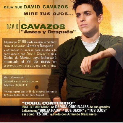 David Cavazos出生于1987年4月19日,18岁开始自己创作歌曲,随后被墨西哥华纳唱片发现,后者给与其个人音乐事业发展的全力支持,并随机与其签下一纸合约。2007年,David Cavazos开始录制他的第一张同名专辑《David Cavazos》,并最终于2008年5月13日正式发行。首波主打《Bruja hada》成为墨西哥电台的超级大热单曲,此曲亦收录在新专辑中……!