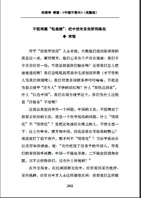 《中国不高兴》,全名《中国不高兴:大时代、大目标及我们的内忧外患》,是一本同道人自由组合而为的时政奇书,一本外界认为中国所处国际环境相对更舒服的时代里诞生出的直刺盲目乐观心态的醒世之作。作者包括宋晓军、王小东、宋强、黄纪苏与刘仰。此书对以美国为首的西方国家提出严厉批评。该书策划者、北京共和联动图书有限公司的董事长张小波表示“它是1996年出版的《中国可以说不》一书的升级版,在过去的这12年里,中国国内外的形势发生了巨大的变化,但有一点没有变,那就是中国和西方摊牌。”值得注意的是,本书的作者之一宋强正是12年前《中国可以说不》的作者之一。