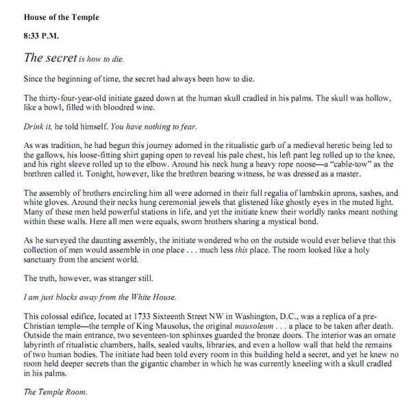 目前,布朗已经完成了该书的全部手稿,但他未透露具体内容,只表示整个故事将集中发生在12个小时之内。