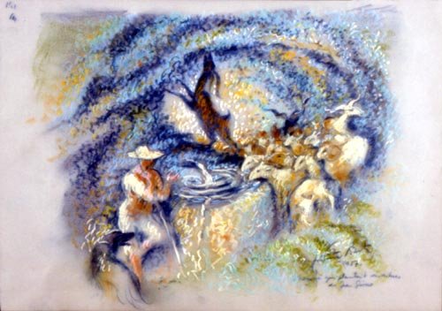 Back: Not a bad idea. He's getting better known in France: there's a museum devoted to him, and traveling exhibitions. When he died, his wife gave some 4,000 drawings to start the museum. His work is a rich documentation of something that no longer exists. During the war, when I was studying with him, Brittany was almost untouched, following its typical way of life for centuries. I had the opportunity to go with him and make drawings beside him. "Draw everything," he told us, "it will all disappear." He was right. Now in Brittany, there is hardly a port. No Bretons in traditional costume, no fishermen, no fish. No colorful nets of string and rope, no iron and wood tools and boats: everything is plastic. It's lost all its character and beauty. The Breton fishermen used to dress all in red or blue, and they would repair their clothes with patches from other material so they were like mosaics of colors, walking paintings. What Méheut drew is a fantastic testimony, a documentation of this lost world.