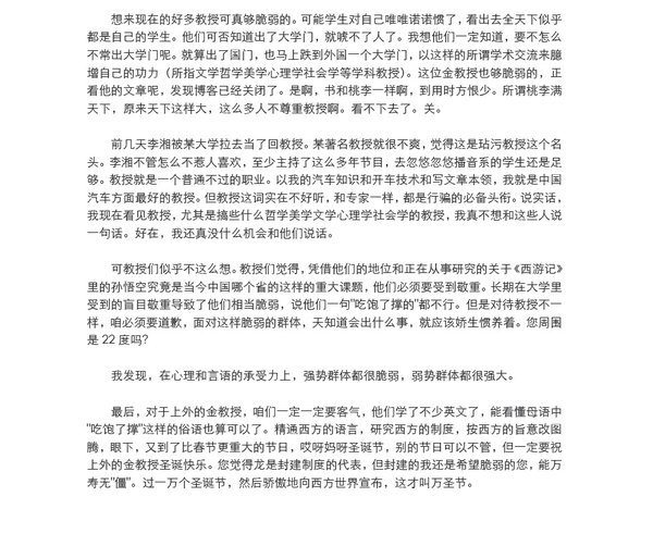 : 第1节:序言(1) 第2节:序言(2) 第3节:"急死你"世界纪录(1) 第4节:"急死你"世界纪录(2) 第5节:脆弱的教授 第6节:国人的奇特心理(1) 第7节:国人的奇特心理(2) 第8节:王朔 第9节:说徐志摩(1) 第10节:说徐志摩(2) 第11节:应该废除学生作文(1) 第12节:应该废除学生作文(2) 第13节:关于高考作文和绝代天骄 第14节:我的前卫与荒唐(1) 第15节:我的前卫与荒唐(2) 第16节:小不点的大不列颠 第17节:一些回答(1) 第18节:一些回答(2) 第19节:一些回答(3) 第20节:一些回答(4) 第21节:中国电影(1) 第22节:中国电影(2) 第23节:中国电影(3) 第24节:关于马的若干问题 第25节:公民韩寒的交通问题(1) 第26节:公民韩寒的交通问题(2) 第27节:公民韩寒的交通问题(3) 第28节:公民韩寒的交通问题(4) 第29节:公民韩寒的交通问题(5) 第30节:公民韩寒的交通问题(6) 第31节:公民韩寒的交通问题(7) 第32节:你为什么比我贵(1) 第33节:你为什么比我贵(2) 第34节:薄薄两毫米,总有一款适合你(1) 第35节:薄薄两毫米,总有一款适合你(2) 第36节:踩死人总是不对的 第37节:别这样 第38节:我不能,我没有 第39节:记一件奇怪的事 第40节:脆弱的生活 第41节:同学聚会 第42节:大航海时代 第43节:凶残的撞击 第44节:小报告和胡指导 第45节:卡门的自我修正主义(1) 第46节:卡门的自我修正主义(2) 第47节:不能拿这个来要求事 第48节:支持海岩 第49节:跑了