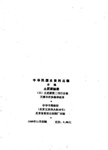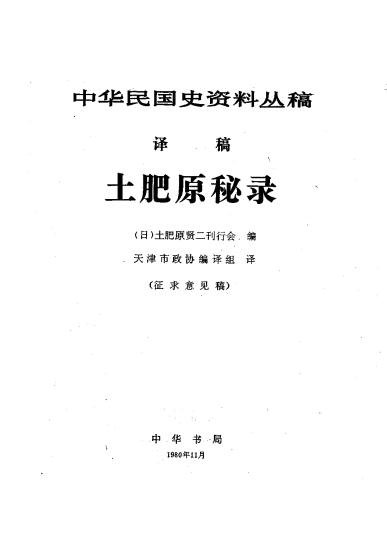 ◎译  者 天津市政协编译组 土肥原贤二(1883年8月8日—1948年12月23日),日本帝国时代的陆军大将,二战甲级战犯。从1913年起在中国从事间谍活动,在1931年策划了九一八事变,扶植清逊帝溥仪在东北成立傀儡政权满洲国。 1935年6月,策动阴谋,逼迫国民政府签署《秦土协定》,取得了察哈尔大部主权。1935年10月,策划华北自治运动。1937年七七事变后,他率日军第十四师团入侵中国。1948年11月12日,土肥原贤二被远东国际军事法庭判为甲级战犯,判处绞刑,12月23日在东京巢鸭监狱执行。在执行绞刑时,抽签抽到第一个接受绞刑。1978年10月被靖国神社合祀。 本书由天津市政协编译组编写,当年系内部书籍。