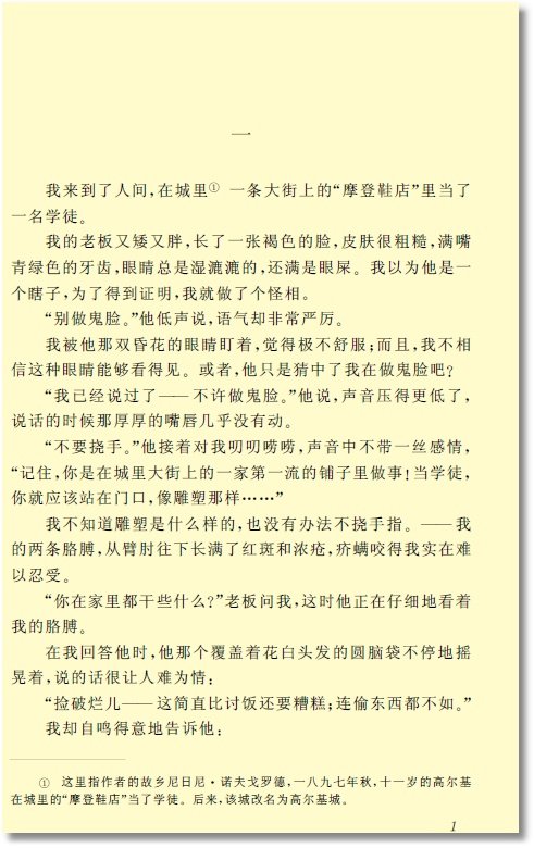 ◎译  者 赵永涛 《在人间》是高尔基自传体小说三部曲中的第二部,描写了他从八岁起到社会上谋生的经历。他先后在鞋店、圣像作坊当过学徒,也在绘图师家、轮船上做过活。其间,他受尽欺凌、毒打、陷害,体验了社会底层生活的艰辛,认识到人性的丑恶。但善良的外祖母、正直的厨师、博学的药剂师等又让他看到人性光明的一面。