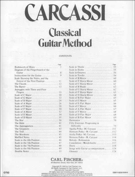 : Rudiments of Music Diagram of the Fingerboard of the Guitar Instructions for the Guitar Scale Showing the Notes, and the Extent of the First Position The Chords The Barrer Arpeggios with Three and Four Fingers Scale of C Major Scale of G Major Scale of D Major Scale of A Major Scale of E Major Scale of F Major Scale of A Minor Scale of E Minor Scale of D Minor The Slur The Slide The Appoggiatura The Gruppeto The Trill The Mordente Muffled Notes Scale in the 4th Postion Scale in the 5th Postion Scale in the 7th Postion Scale in the 9th Postion Double Notes Scale in Thirds Scale in Sixths Scale in Octaves Scale in Tens Scale of B Minor Scale of F Sharp Minor Scale of C Sharp Minor Scale of B Major Scale of G Sharp Minor Scale of F Sharp Major Scale of D Sharp Minor Scale of B Flat Major Scale of G Minor Scale of E Flat Major Scale of C Minor Scale of A Flat Major Scale of F Minor Scale of D Flat Major Scale of B Flat Minor Harmonics Fifty Exercises Progressing in Difficulty Agitha Polka——M. Carcassi Hermose Polka——M. Carcassi Azelia Polka——M. Carcassi Hermina Polka——M. Carcassi Melody——Rubinstein Consolation——Mendelssohn Duets Songs with Guitar accompaniment Glossary