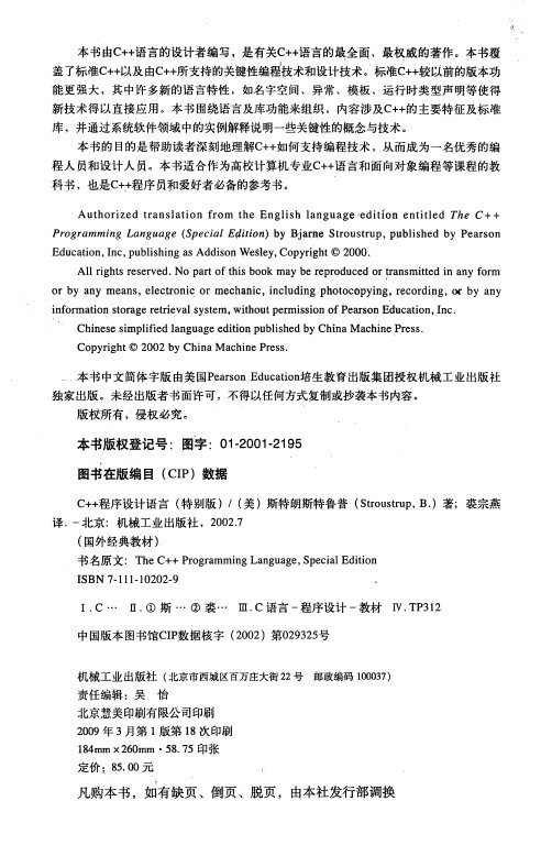 特别的书,特别的版本,特别的作者,特别的译者。 这是一本特别的书,是世界上第一部关于C++的著作,是关于C++语言及其程序设计的最重要的著作,是在C++领域中地位无法替代的一部杰作。这是该书的最新版本,也最能反映最新的C++标准。