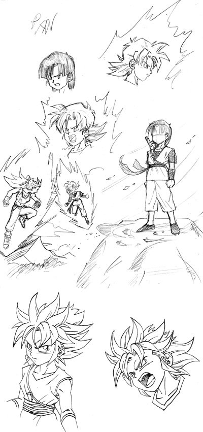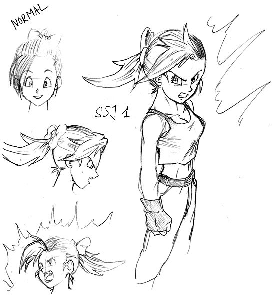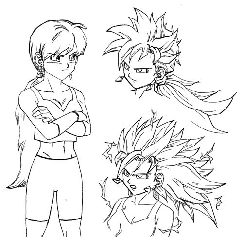 在这张图中你会看到Gogeta JR的第一稿以及我要尝试的所有发型。最后我们还是选用了她Z结尾发型略微修改的版本。 布拉