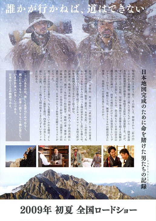 《剑岳:点之记》是一部关于为了完成日本地图而搏上性命的男人们的故事。影片拍摄毫不借助CG和航拍,演职人员们踏着一百年前测量队的足迹攀登险峰,追求绝对的真实。