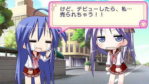 PSP版新作《幸运星:网络偶像大师》重点将是宣传。而为了让以上四位幸运星们迅速成为偶像,身为经纪人的玩家需要在泉此方的街、秋叶原、网络社区、博客这四个主要地点秀出偶像的风采,只有被人们熟知才能迅速提高人气,为今后的发展创造更好的条件。
