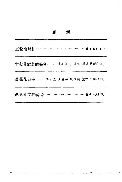 这是八十年代中期发表的传奇故事,以肖士太、黄宣林、欧阳德整理改编的《蔷薇花案件》反响最大。蔷薇花案件是文化革命中流传较广的一个故事,根据流传在江西九江地区的口头版本改编而成,各节分别加了标题,这些标题是:珍贵的礼物、手表的来历、急诊室的病号、挂钟里的匕首、奇特的葬礼、棺材里的秘密、舞厅里的巧遇、小镇上的枪声、神秘的“2400”等。这篇长达五万多字的故事,从1983年第八期开始,刊物用了整整五期的版面予以连载,一直到第二年的第一季度才结束。本书中共有四个故事:五粒蝴蝶扣、十七号病房的秘密、蔷薇花案件、两只黑宝石戒指。
