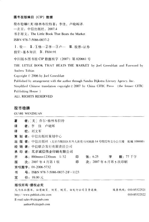 乔尔的投资公司在20多年间年均回报率达到了40%。他将告诉你,投资与专业背景及智力水平无关,任何年龄、身份的投资者都可以很容易地在投资中获得成功,只要你明白炒股究竟是怎么一回事,坚定不移地套用“神奇公式”,并有足够的耐心长期持有被该公式选中的股票。