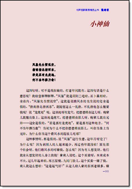我们的相声演员不光是演员,而且都应该是研究工作者。比如天津的张寿臣先生,他的单口相声集就是给我们留下的宝贵遗产,有很高的借鉴价值。