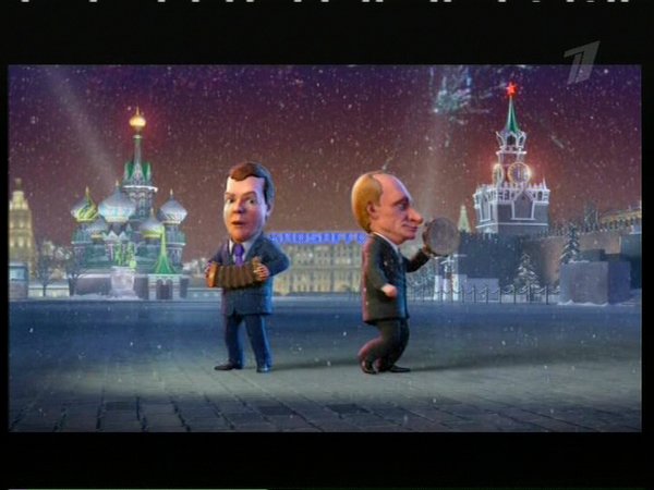 俄罗斯国家电视台第一频道2010年1月1日播出特别节目:总统德米特里·梅德韦杰夫拉起手风琴,总理弗拉基米尔·普京摇着铃鼓,两人边舞边唱,向民众祝贺新年。