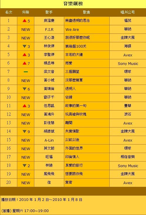 CHANNEL[V]【音乐飆榜】2010年全新改版向全亚洲发声!亚洲音乐排行榜指标节目【音乐飆榜】将在2010年1月2日起每週六下午5点到7点推出全新改版内容,节目时段加长,节目内容也大幅增加,除了华语排行榜外,更新增东洋、西洋两大排行榜,节目主持人也从容嘉外,再新添生力军大嘴巴,将由大嘴巴负责东、西洋排行榜,而容嘉则继续主持华语榜,5人新组合群将提供最新的音乐资讯、最热门的音乐录影带,以及亚洲最具影响力的音乐录影带排行榜。