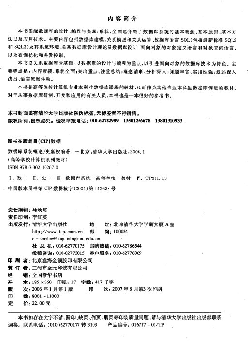 本书以关系数据库为基础,以数据库的设计与编程为重点,以引进面向对象的数据库技术为特色。主要特点是: 内容新颖、系统全面;突出重点、注重总结;概念清晰、分析深入;例题丰富、实用性强;叙述深入浅出、语言流畅生动。