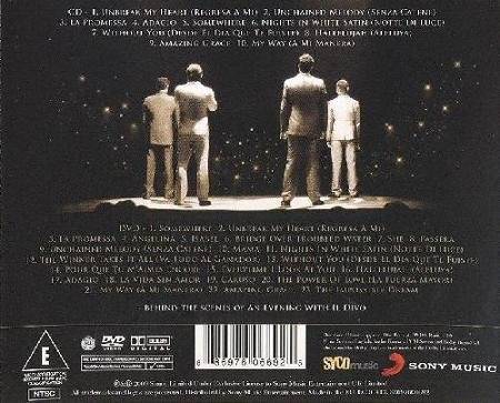 Following Il Divo's largest worldwide tour, encompassing 81 cities and 32 countries, they release An Evening With Il Divo – Live In Barcelona, a sublime 10-track CD and accompanying DVD. The Barcelona show was Il Divo's biggest capacity performance in Europe and took place at Palau Sant Jordi (20,000). The 10-track CD boasts rich and diverse repertoire from their five studio albums, featuring songs from their latest record The Promise. Accompanying the CD is a live DVD of the show in English and Spanish versions. The DVD features two songs never before recorded by the band, Bridge Over Troubled Water and The Impossible Dream, as well as insightful behind the scenes footage and a making of the tour interview with Il Divo. The dazzling live show was staged and choreographed by William Baker (Kylie) on a state of the art set.