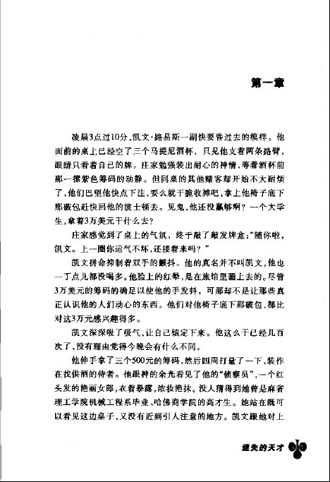 如果要问谁最不愿意读者翻开这本书?或许该说是美国的赌场吧——赌场害怕人们洞悉其底细,害怕赌客把他们赢个落花流水。《迷失的天才》第一次披露出赌场计牌客的内幕,把读者带到赌博业鲜为人知的地下世界——密室、摄象机、逐渐升级的对抗……这群年轻人,用一些似是而非的理由支撑自己,游走于双重人格,沉溺于绚烂幻梦——直到赌场侦探狂怒地追踪到波士顿,突然之间,他们再也无法在假证件和化装术后面藏身,豪华生涯像一手坏牌一样土崩瓦解。
