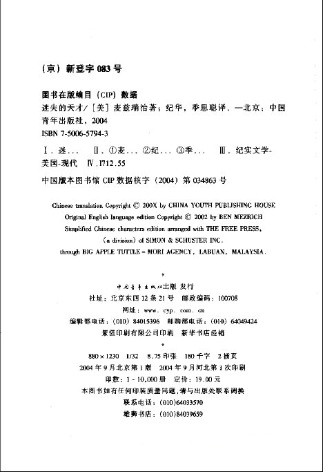 本·麦兹瑞治(Ben Mezrich),1991年从哈佛毕业后,出版了《门槛》、《丰沃的土 地》、《皮》等六本畅销小说,以9种文字发行了100多万册,其中《收获者》还被TBS电视网改编成当红影片《致命的错误》(Fatal Error)。《迷失的天才》这本书于2002年出版之后,在《纽约时报》畅销书排行榜上长期名列前茅,到本文脱稿的2004年底,仍然在平装本畅销榜上,已经连续畅销了53周。