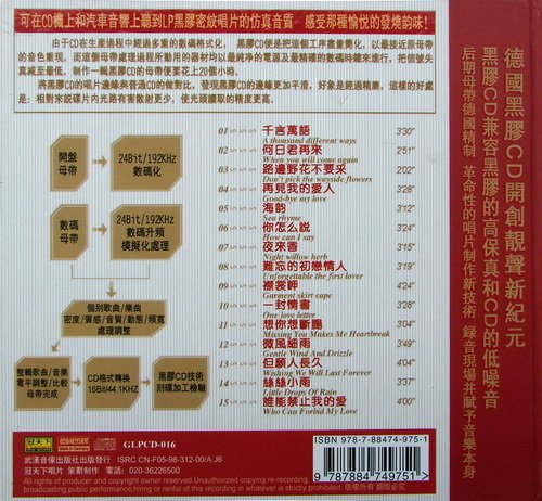 这是冠天下唱片公司策划制作的一组邓丽君的黑胶CD的第一张。黑胶CD兼容黑胶的高保真和CD的低噪音,后期母带德国精制,革命性的唱片制作新技术,录音现场并赋予音乐本身。本系列共三张。 提供MP3版本,压缩包里均包含唱片封面图片。 邓丽君就无需介绍了,华语歌坛的神话,无人企及。