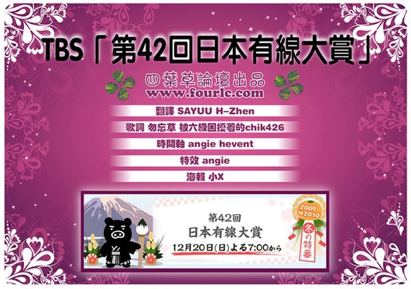 【简 介】:感谢所有制作人员。也感谢观看字幕档的大家^^ 依然是普档与HD同时发布… 因为年末有几个大家伙,有线赏的压制工作拖到现在,对期待其他这场晚会的朋友说声抱歉了。本次分上下两部分 更新完毕。有CM