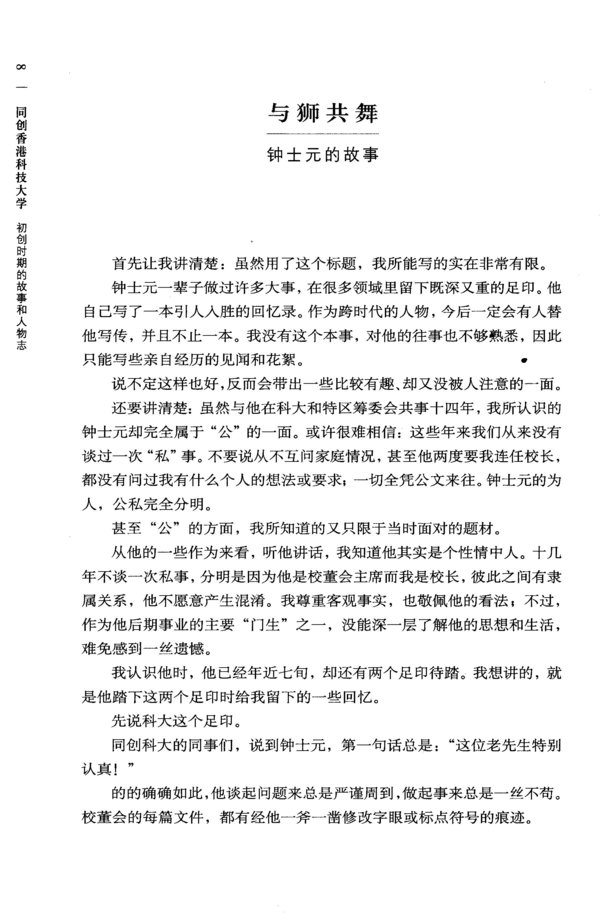 作者自谦这是一部片面和短暂的回忆录。大部分篇幅描述初创时期的教授和职员,也讲到自己的心路历程。但作者给予读者的,是全面的、前所未有的揭示:个人对香港体制的诚恳观察,以及一群教育界的理想主义者,回归故里,开拓新土,以团队精神试图创造奇迹的故事。兼任物理学教授。