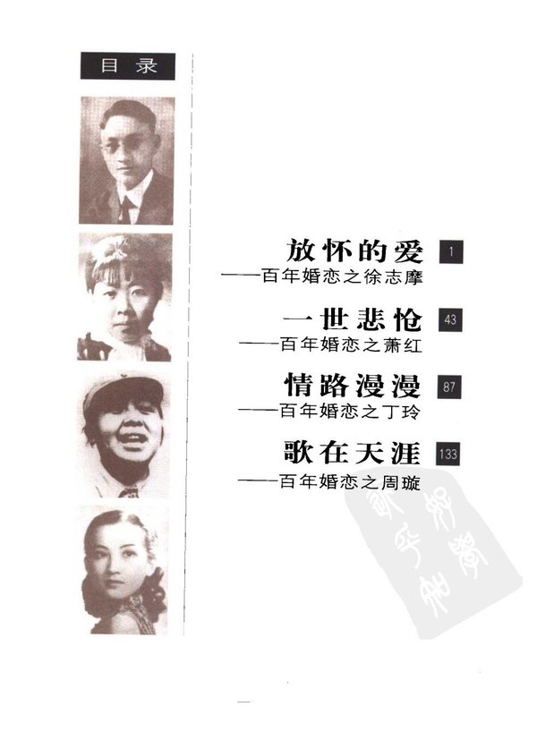 : 第一部分放怀的爱——百年婚恋之徐志摩 第二部分一世悲怆——百年婚恋之萧红 第三部分情路漫漫——百年婚恋之丁玲 第四部分歌在天涯——百年婚恋之周璇