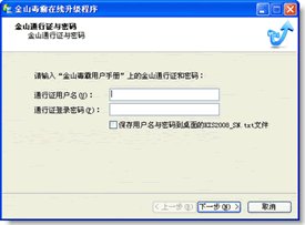 2.在安装金山毒霸2009版的过程中,在相应的页面输入本卡附带的金山通行证和密码,便可享受升级服务;