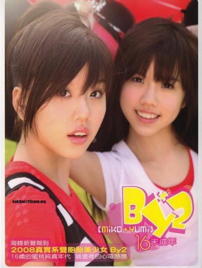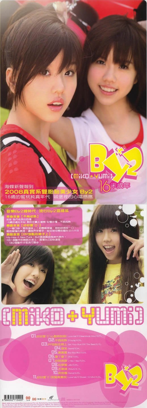 16岁 双胞胎 青春无敌 两次方白色   未成年城堡里的真实告白   蜜桃纯真 动静实力   今年盛夏 真实系双胞胎美少女 16未成年 By2   16岁以前的你 是什么模样?   要远离父母,在短短的日子里经历台北、东京、北京---亚洲三大城市的洗礼,带着简便的行囊,开始与音乐产业最前线的老师们 学习最严峻的各种本领,然后,去带领一场音乐革命……   或许,你觉得她们还不够成熟   或许,你可以再回想当年16岁的自己   nothing is impossible --- By2   全世界 有6个跟自己90%相像的人   全世界 双胞胎平均出生率为1∶89   1分钟的差距 双胞胎的心电感应   如果 我们给他们1分钟   他们 即将透过Girl Power让我们看见1+1不等于2的更大能量 因为 By2不只是By2   1992年 安室奈美惠 2001年 宝儿   2008年 By2 动静姿态 舞与伦比 青春无敌 魅力无限   可口的声音、力量十足的舞蹈、阳光般的脸庞、细致的心灵....   By2年代来了   By2=姊姊Miko+ 妹妹Yumi=‘白’氏双胞胎姊妹=两次方白色   16岁,1992年3月23日出生,来自新加坡的‘白’氏双胞胎女孩,从2,500人的新秀甄选会中脱颖而出,青春活泼的表演爆发力,迅速引发中台新马网友注意,“为追逐梦想而休学”、“到底是不是"刘德华的女儿"”….意外的新闻事件,让她们登上新马社会版头条新闻,煞时间,未出道的By2却成为各界媒体关注的焦点!   2008年春天, By2以素人的姿态从网路开始发声,1个月就攻下各大网站,超过2,000万人次点阅率…不仅获得台湾“名人堂”总冠军;在中国各网站,点击率更超越S.H.E、五月天及F.I.R….到底谁是By2 ?!甜美笑容之下,到底隐藏着什么样的故事?现在,海蝶音乐正式为你揭开By2的魅力乐章……..   16岁的未成年城堡里 By2 是一对勇敢追寻梦想的胞胎姊妹   Miko和Yumi从小就热爱表演,在父母的鼓励下,姊妹俩人在14岁那年报考了“海蝶森林非常歌手训练班”。而后2007年6月参加了马来西亚举办的“卧虎藏龙选秀比赛”,从2,500人中脱颖而出,入选14强进行PK赛,最后BY2获得第2名的荣耀,也为自己赢得第一份唱片合约!   新加坡位于东南亚的城市岛国,从小就在新加坡成长的By2,生活环境宛如就在一座城堡里呵护长大,两位双胞胎女生对于未来的世界充满好奇,更期待某天能有机会走出城堡,探险外面的世界!一直以来双胞胎的神秘色彩,令人好奇而探索,除了双胞胎的外型神似度,更想窥探双胞胎心电感应的独特指数,双胞胎有太多让人猜不透的奥妙……16岁的双胞胎,青春无敌,两次方白色的By2   音乐by2跨时代 流行by2混搭风   By2 16未成年的溷搭音乐童话   青春宣言【不够成熟】   那是 我们成长的回忆   16岁的尴尬年纪 爱的定义太辽阔 似懂非懂….不够成熟.   恋爱宣言【好好爱^0^ 】   “一种口味、双倍滋味”!初恋般幸福,甜的好想咬一口!   期待爱情的异想,让我们手牵手一起迎接初恋甜蜜酸涩的来临!   舞动宣言【PP别黏在椅子上】   Hip Hop + New Funk,By2混搭舞曲精神代表作。   2拍1个动作的舞蹈太老土,跟着By2加快速度,1拍2个动作才是流行舞步