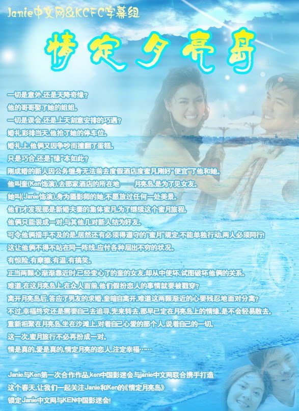 【剧  名】:情定月亮岛 【集  数】: 【年  份】:2003年 【格  式】:Rmvb 【语  言】:泰语 【字  幕】:中字 【主要演员】:Janie Ken 【内容简介】:   一切是意外,还是天降奇缘?   他的哥哥娶了她的姐姐。   一切是误会,还是上天刻意安排的巧遇?   婚礼彩排当天,他抢了她的停车位。   婚礼上,他俩又因争吵而撞翻了蛋糕。   只是巧合,还是“缘”本如此?   刚成婚的新人因公务缠身无法前去度假酒店度蜜月,刚好“便宜”了他和她。   他叫奎(Ken饰演),去那家酒店的所在地——月亮岛,是为了见女友。   她叫沌(Janie饰演),身为摄影师的她,不愿放过任何一处美景。   他们才发现那是新婚夫妻的集体蜜月。为了继续这个蜜月旅程,他俩只能装成一对,与其他几对新人结为好友。   可令他俩措手不及的是,居然还有必须得遵守的“蜜月”规定:不能单独行动,两人必须同行!   这让他俩不得不站在同一阵线,应付各种层出不穷的状况。   有惊险,有摩擦,有温馨,有搞笑。   正当两颗心渐渐靠近时,已经变心了的奎的女友,却从中使坏,试图破坏他俩的关系。   难道,在这月亮岛上,在众人面前,他们假扮恋人的事情就要被戳穿? 离开月亮岛后,沌答应了男友的求婚,奎暗自离开,难道这两颗渐近的心要残忍地面对分离?   不过,幸福终究还是需要自己去追寻,兜来转去,那早已定在月亮岛上的情缘,是不会轻易散去。   重新相聚在月亮岛,坐在沙滩上,对着自己心爱的那个人,说着自己的一切。   这一次,蜜月旅行不必再扮成一对。   情是真的,爱是真的,情定月亮的恋人,注定幸福……