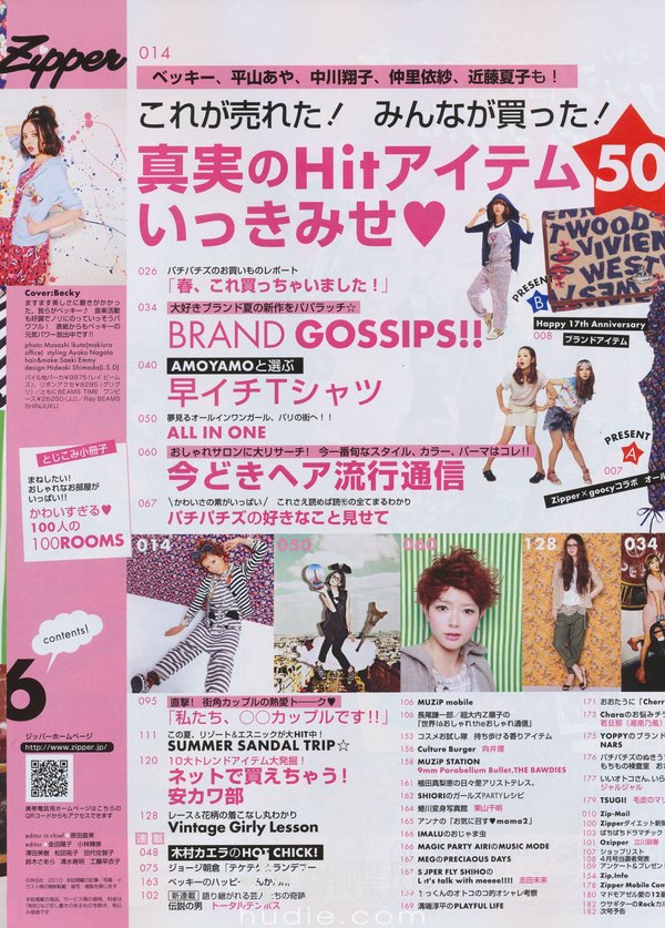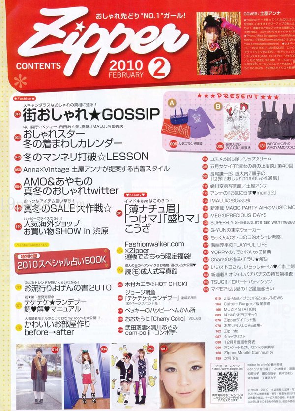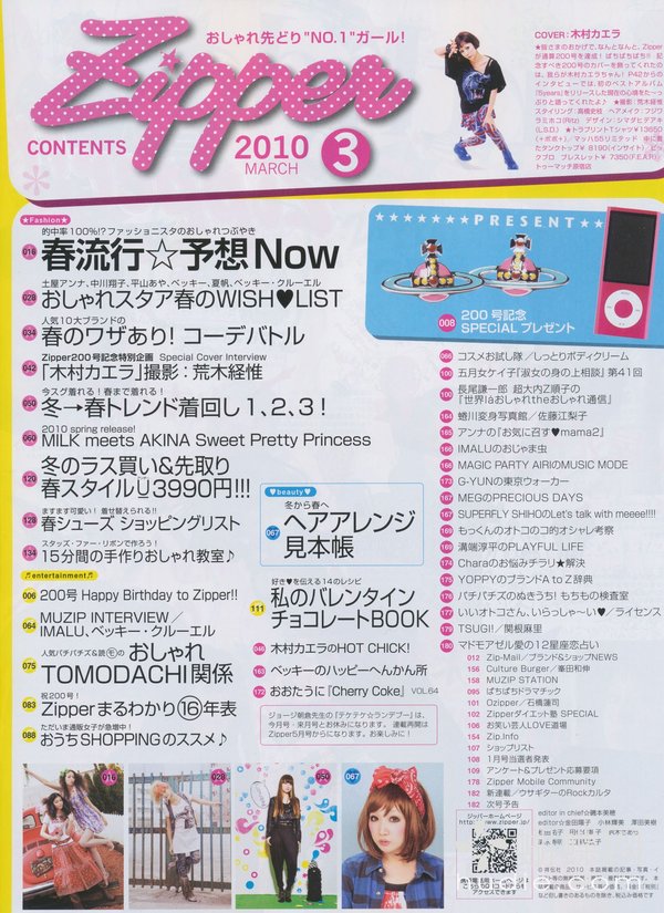 除此之外本志也深入少女们的生活,除了介绍流行资讯,还独家连载了最受欢迎的少女漫画作家矢泽爱老师的最新作品,喜欢矢泽爱老师「NANA」的读者们,当然也不能错过在Zipper中连载的作品,其作品中角色的衣装设计,很多也都和Zipper有所结合,推出独家的衣饰哦。