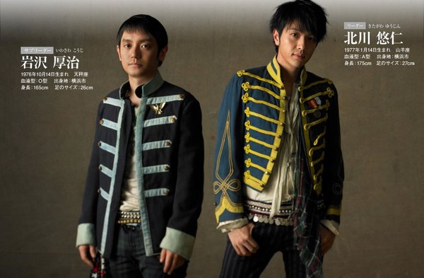 Leader:北川悠仁 (きたがわ ゆうじん KITAGAWA YUJIN ) 1977年1月14日生 山羊座 血型:A 高:175cm 脚长:27 出生地:横滨市 出生地:横滨市 在高中进入篮球社之前一直是个超可爱的小胖子,很 喜欢[灌篮高手]。另外对於跑马拉松也十分在行。髮型经常 都会改变,崇拜约翰列儂,曾经还因为崇喜欢X-JAPAN的YO SHIKI而在乐队担任鼓手一职.也有在电视剧中出演角色(但是 偶都没看过啊TOT)。但是08的月九中yujin桑终於演上[Innocent Love]中微笑博爱的男主旬也桑~TAT Assistant Patrol Leader:岩泽厚治 (いわさわ こうじ IWASAWA KOUJI ) 1976年10月14日生 天秤座 血型:O 高:165cm 脚长:26 和yujin桑是小学就认识的。是一个一直将吉他抱在怀里爱不释手的少年。长相老实忠厚的kouji桑髮型也几乎没怎么变过,据说是因为变来变去太麻烦。爱啤酒,香烟达人。右眼下面的泪痣也很明显。一心一意搞创作的爱心派人士。