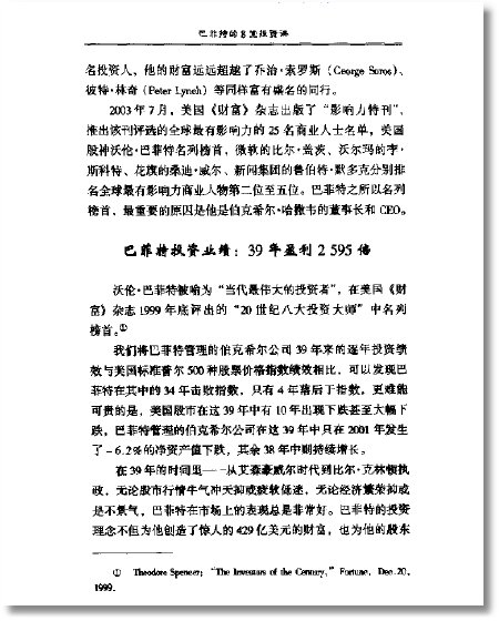 ◎译  者 N/A   沃伦·巴菲特是当代世界上最伟大的投资者,在1999年年底美国《财富》杂志评出的“二十世纪八大投资大师” 中名列首位。1956年,巴菲特以100美元起家。2004年,在《福布斯》全球富豪排行榜以429亿美元再度名列世界第二富翁。巴菲特创造了39年来以超过美国股市平均收益率1倍多的优势持续战胜市场的投资神话。如果一个人在巴菲特职业生涯开始时(1956年)投入1万美元并且坚持到底,那么到2002 年,它将变成约2.7亿美元,而且是税后收入。因此,巴菲特当之无愧地被称为“华尔街股神” 。   本书将巴菲特关于股票投资策略的智慧论述按照投资操作的基本步骤进步总结,汇编成只需几个小时就能完成的 8堂“投资课”,使本书成为一本巴菲特为投资者讲述如何进行长期投资的生动活泼的详细教程,是投资者在较短时间学习巴菲特关于股票投资策略精华论述的最佳选择。