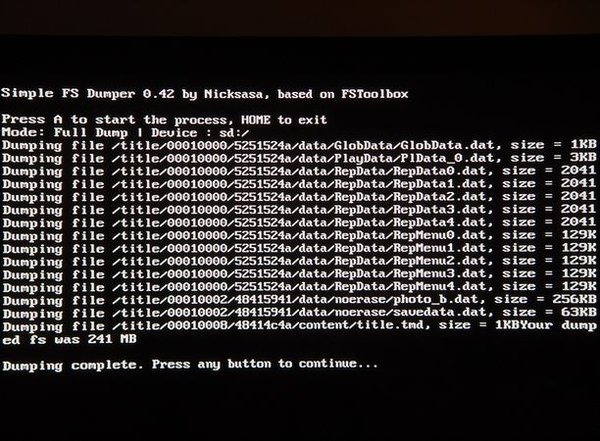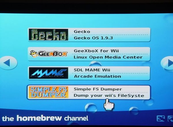 1、首先必须确保安装WiiWare的分区为硬盘第一分区,文件系统我用的FAT32,NTFS未做测试。接着需要用到Simple FS Dumper将主机NAND里的系统文件导出来,以便用于在硬盘上模拟主机系统环境。