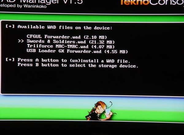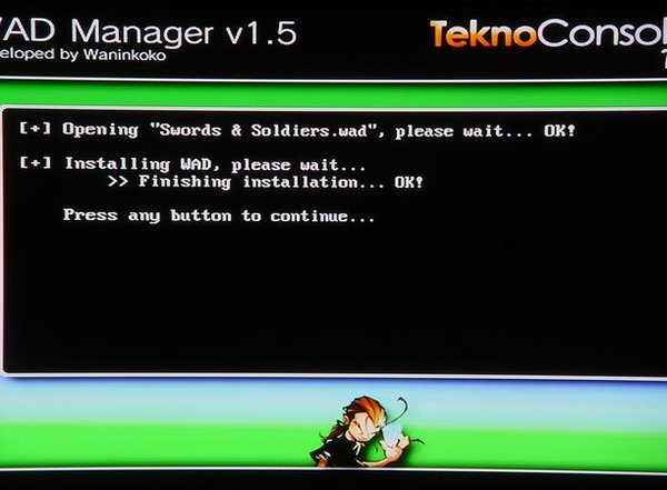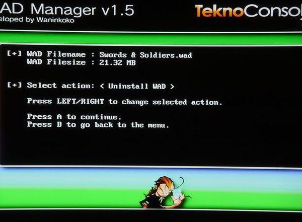 7、此处选择Install WAD,按左右键可切换为Uninstall WAD,欲删除WiiWare时可选此操作。